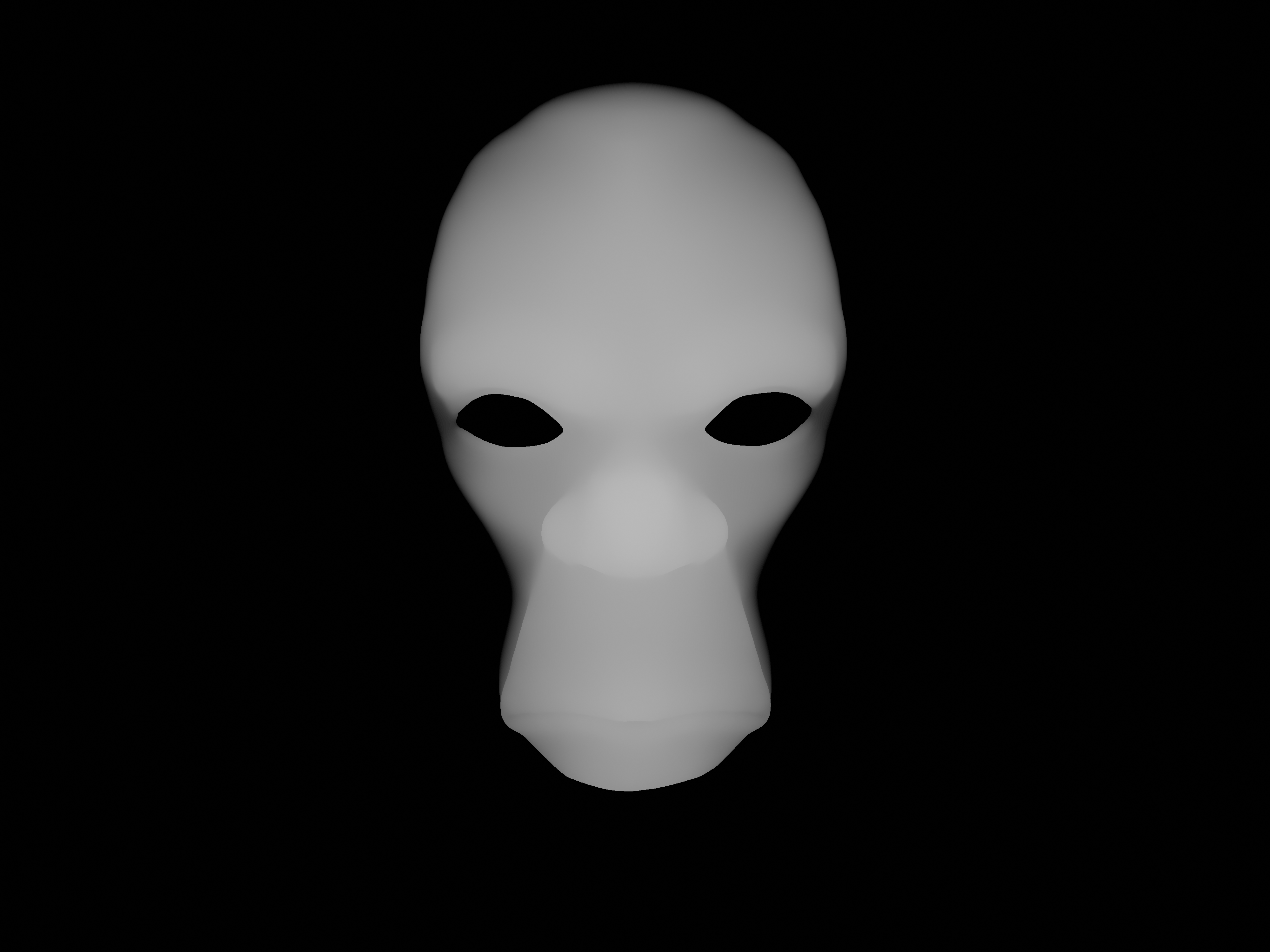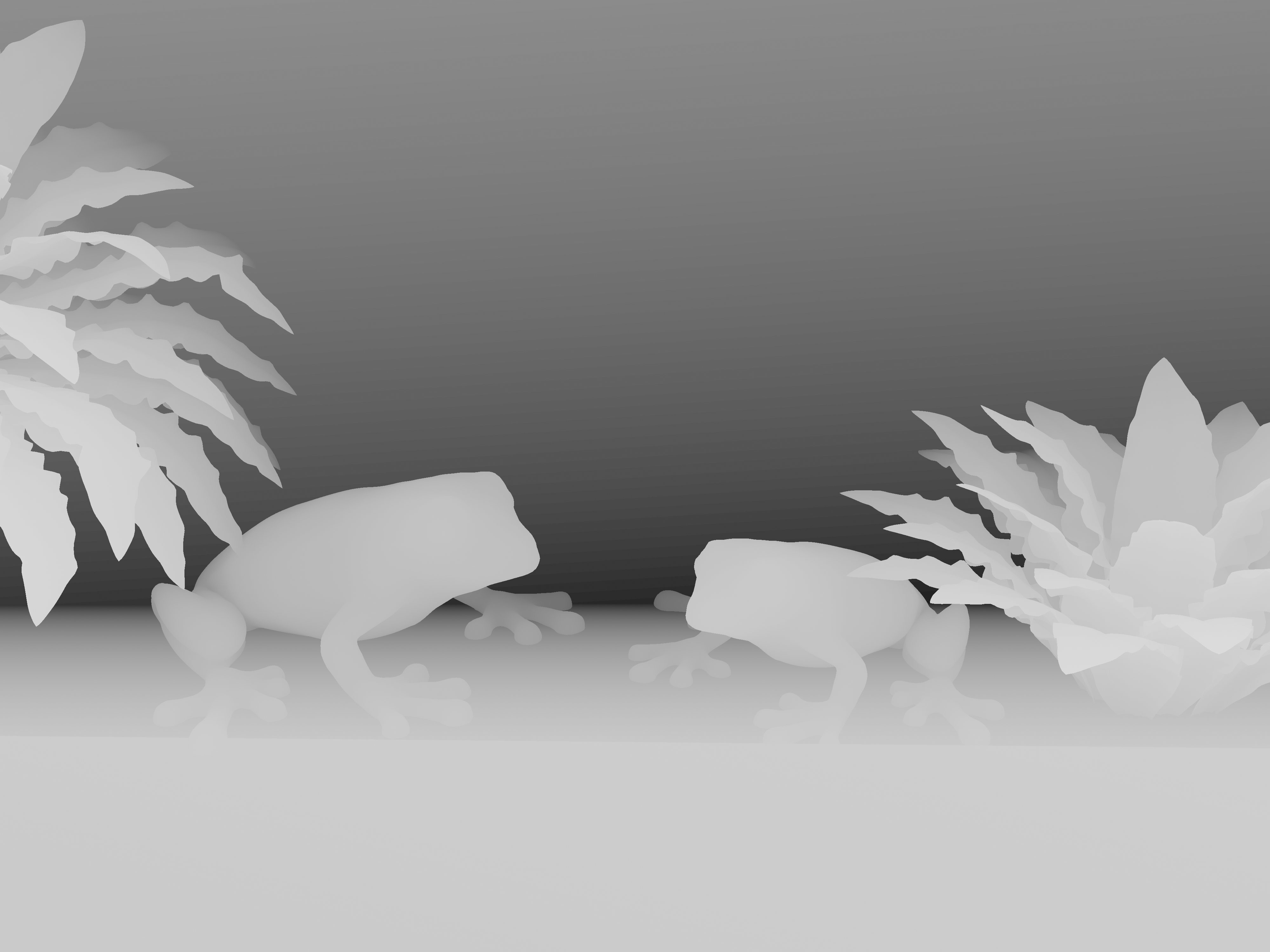 This stereogram is my first multi object scene, displaying two plants, two frogs, and a curved floor, shown below is it's depth map image.